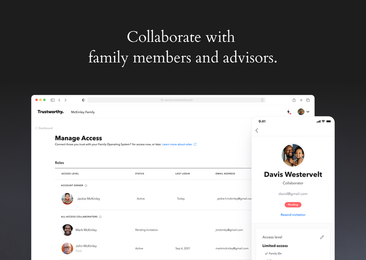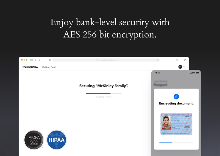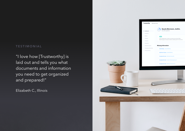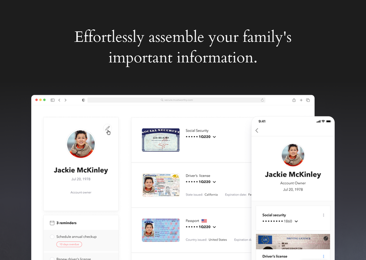 Trustworthy is the Family Operating System®, an online service that helps modern families protect, organize and optimize their important information — ID’s, Money, Property, Passwords, Insurance, Taxes, Legal, Emergency Instructions and the Family Archive. With Trustworthy, families are delightfully organized and completely prepared for all of life's moments, now and across generations.